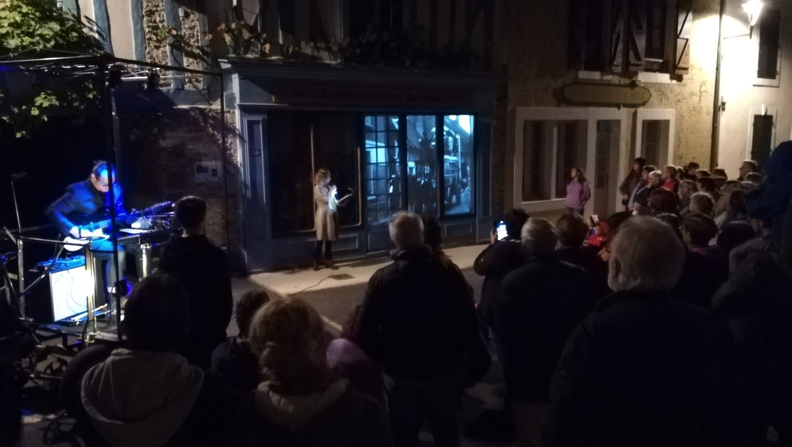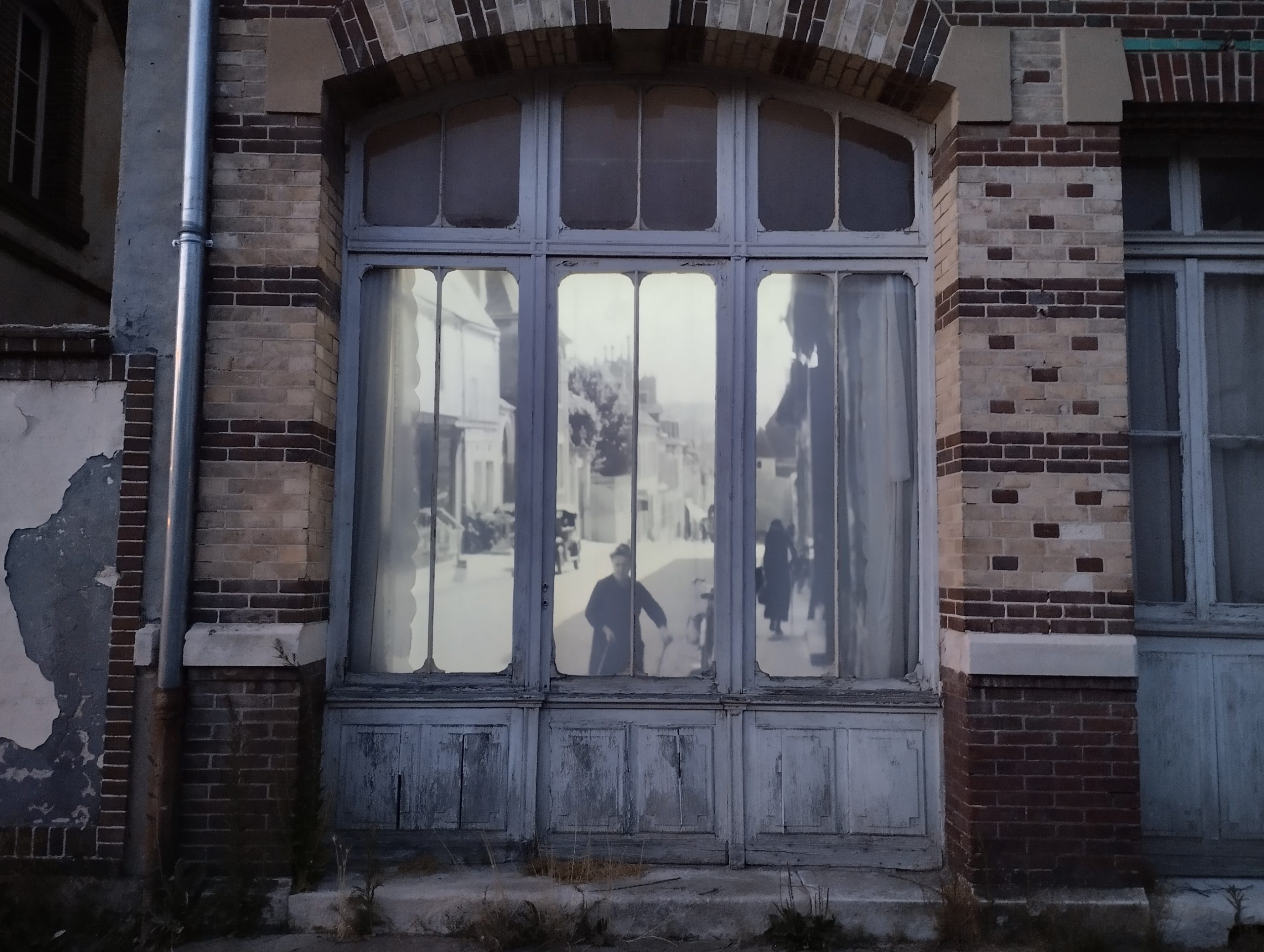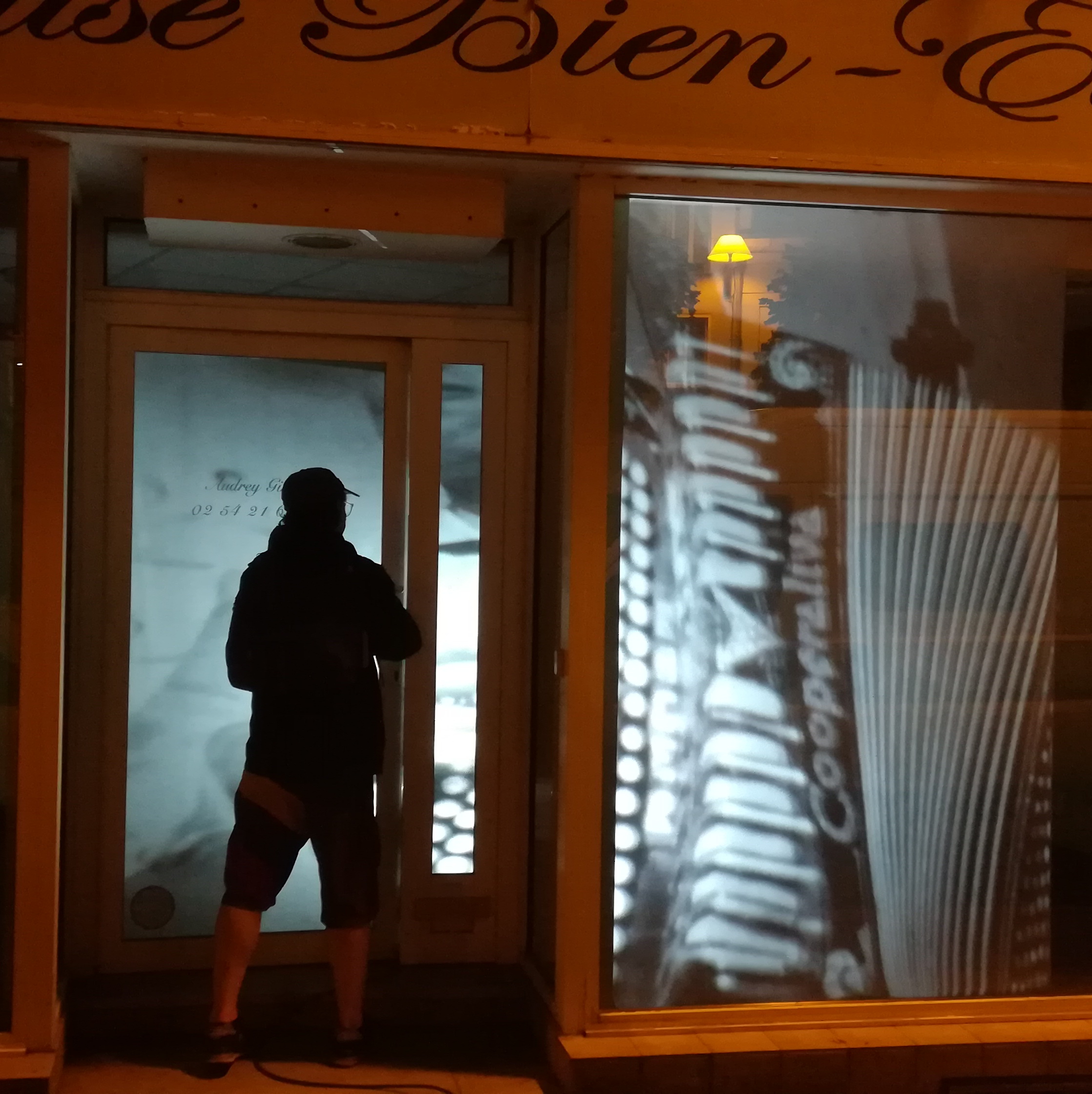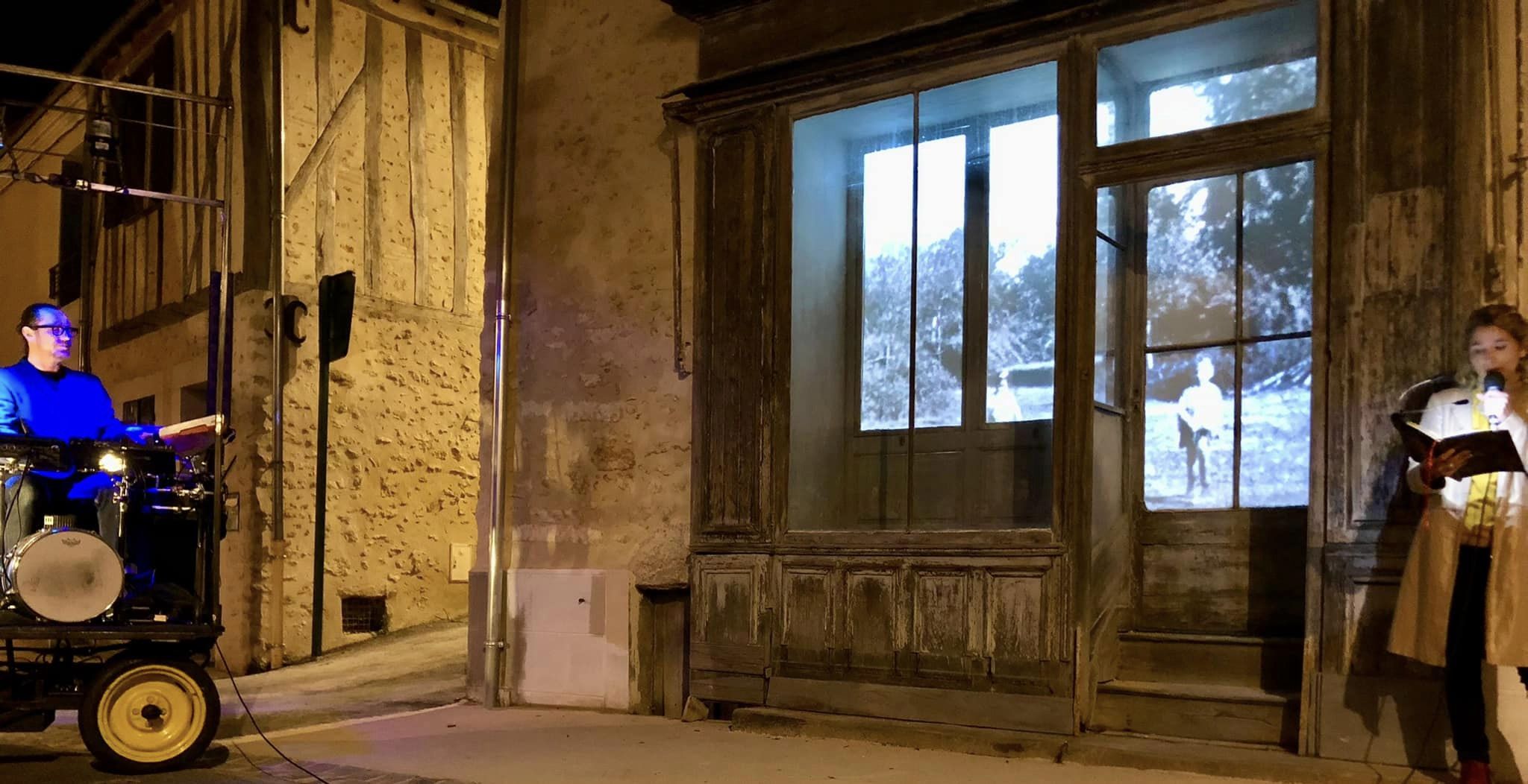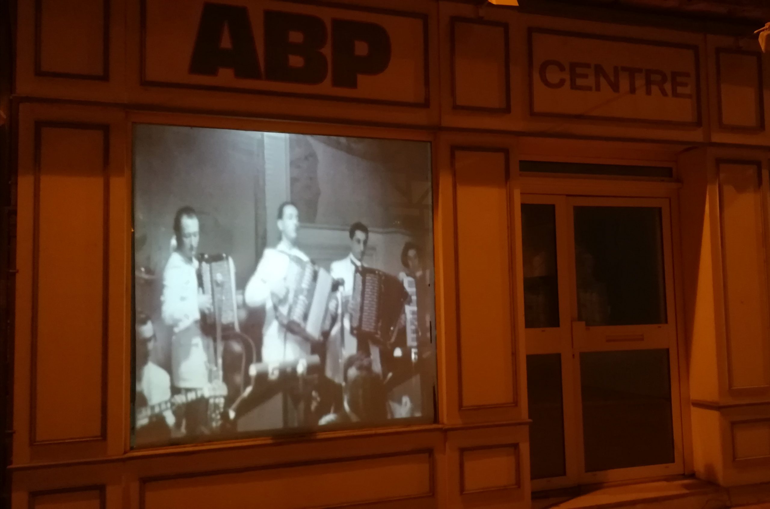 À travers les rues, le public déambule, guidé par un délégué au patrimoine de la cinémathèque régionale, accompagné d’un musicien sur une scène mobile et d’une comédienne, pour une plongée dans ces mémoires filmées, projetées dans des vitrines de magasins aujourd’hui à l’abandon.