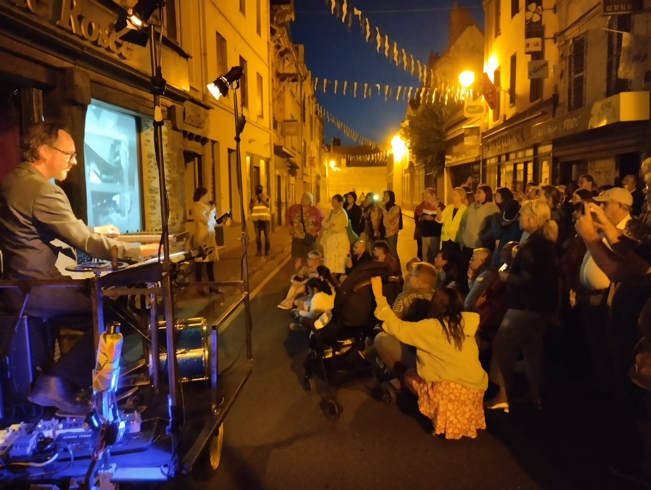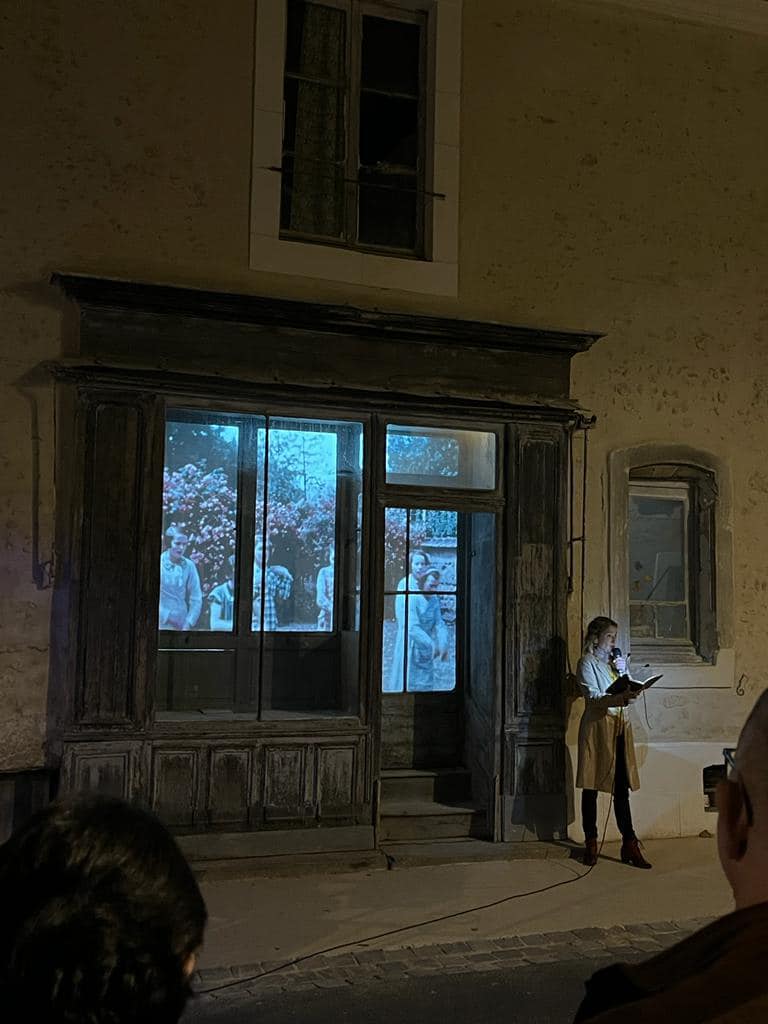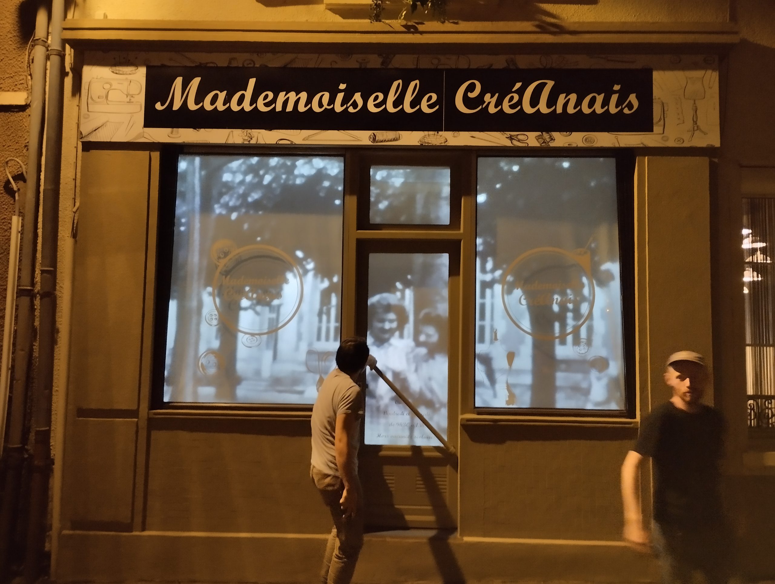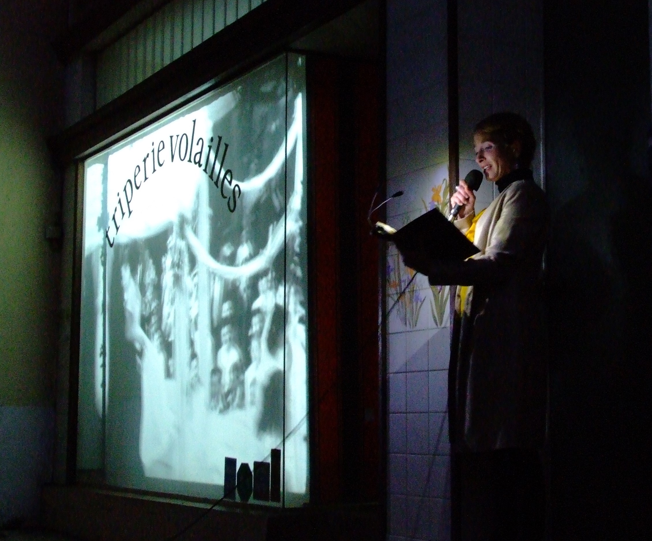 À travers les rues, le public déambule, guidé par un délégué au patrimoine de la cinémathèque régionale, accompagné d’un musicien sur une scène mobile et d’une comédienne, pour une plongée dans ces mémoires filmées, projetées dans des vitrines de magasins aujourd’hui à l’abandon.