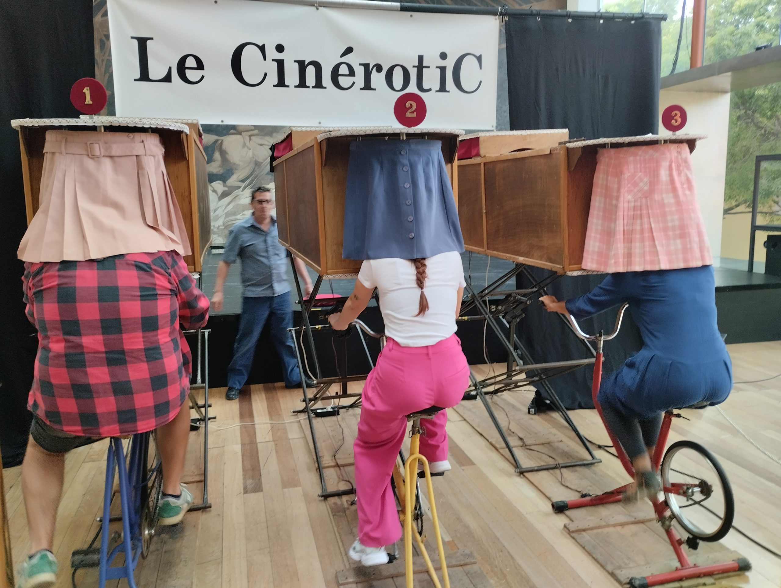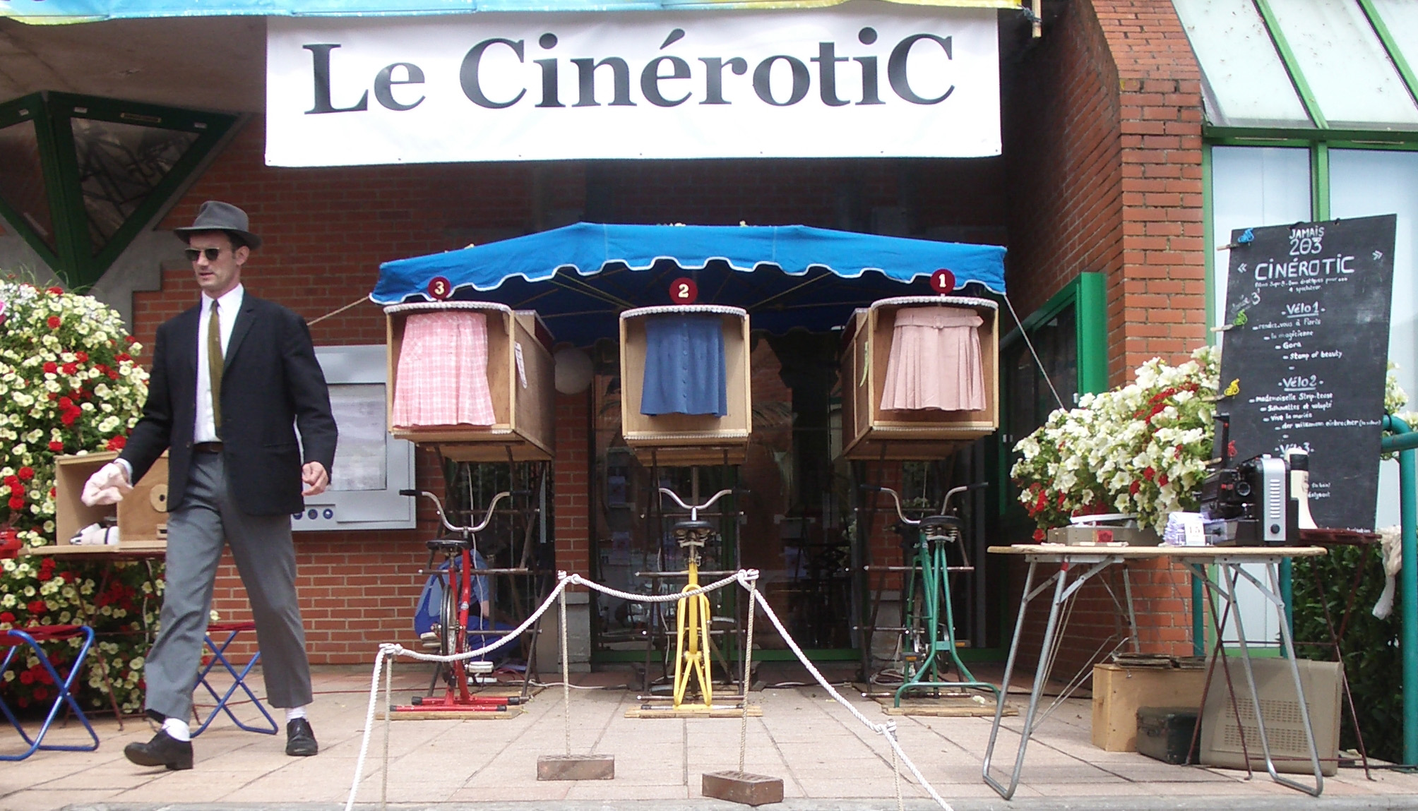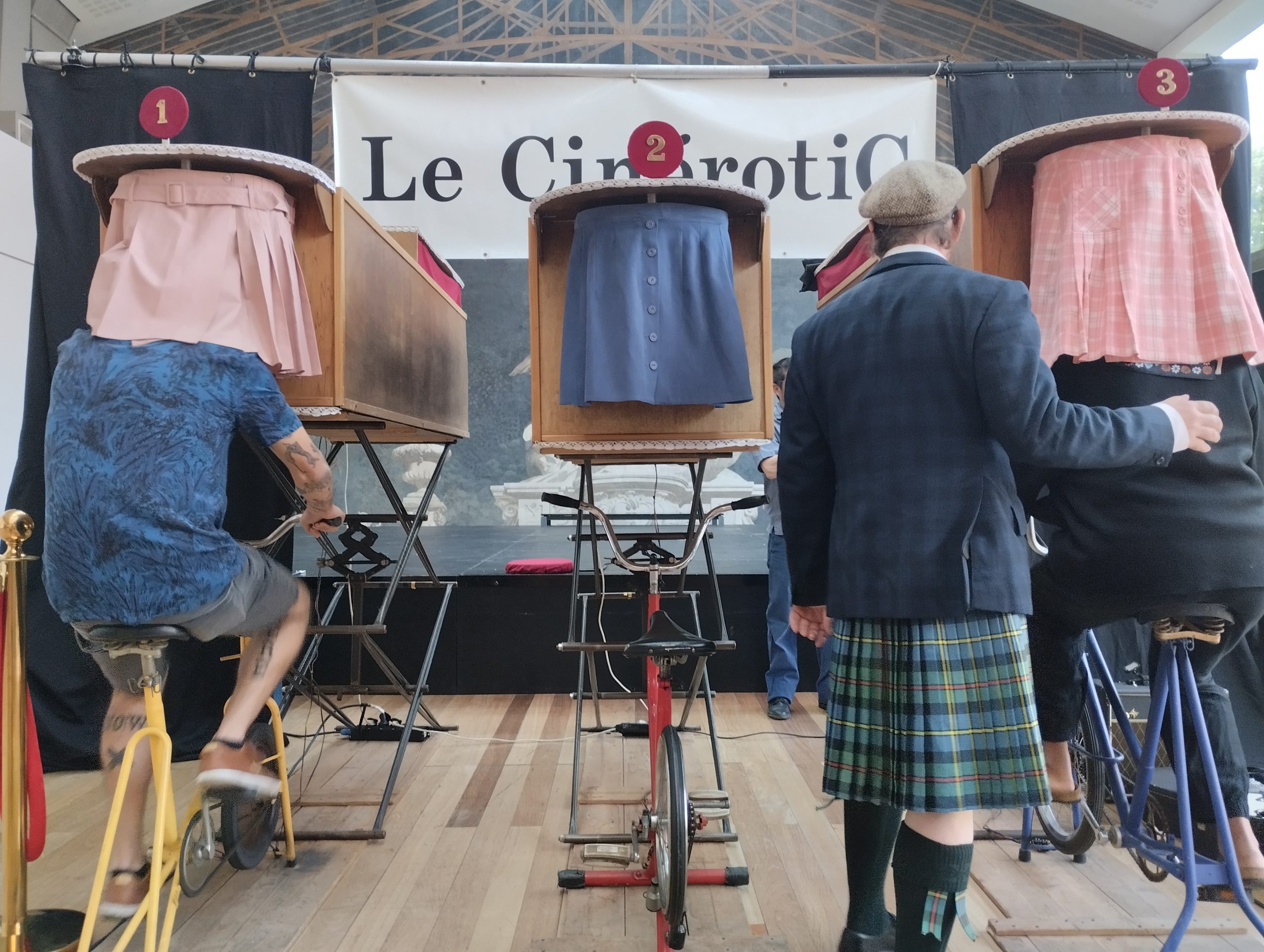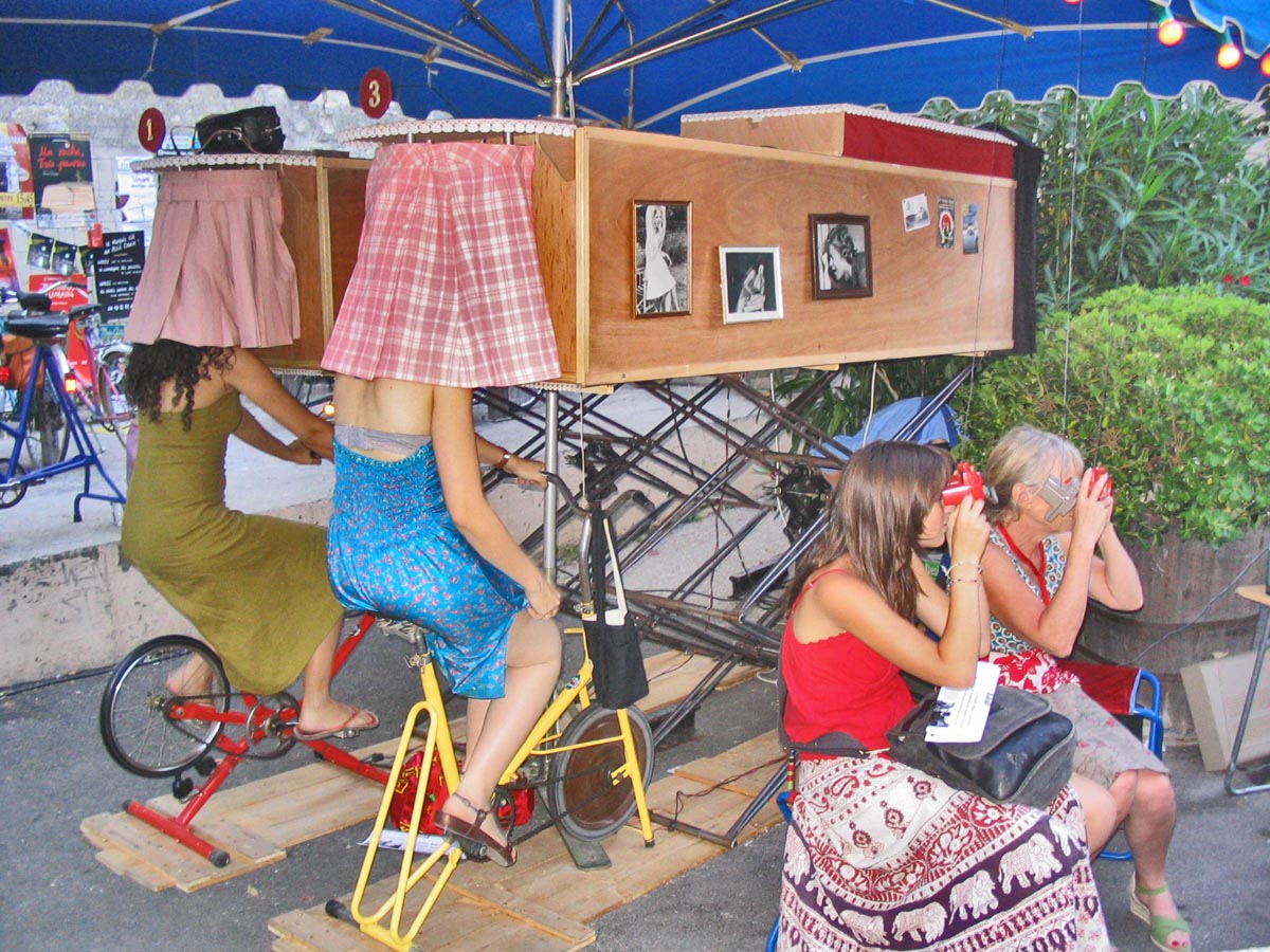 Une attraction foraine pour…1 spectateur(trice) et une file d’impatient(e)s passionné(e)s de bicyclette et d’humour mécanique, avec 3 cabines individuelles de projection de films vintage coquins en Super 8. Une invention digne d’un prix au fameux “concours Lépine”.